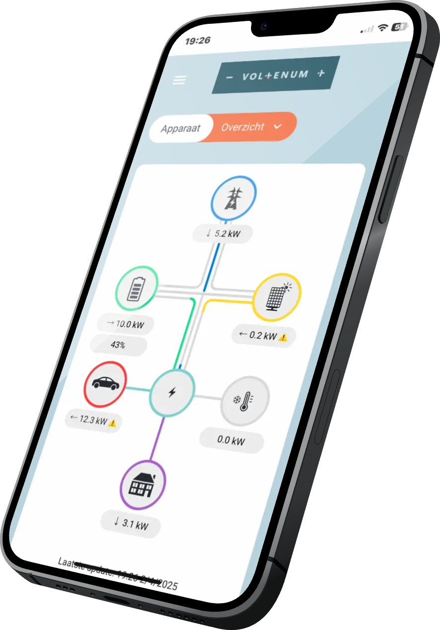 Ons energie management systeem (EMS) dat het energieverbruik monitort, analyseert en optimaliseert om kosten te verlagen en duurzaamheid te verhogen. Een EMS-systeem combineert hardware (de gateway en de hybride omvormer) met onze software om inzicht te geven en apparaten zoals zonnepanelen, thuisbatterijen en laadpalen slim aan te sturen.