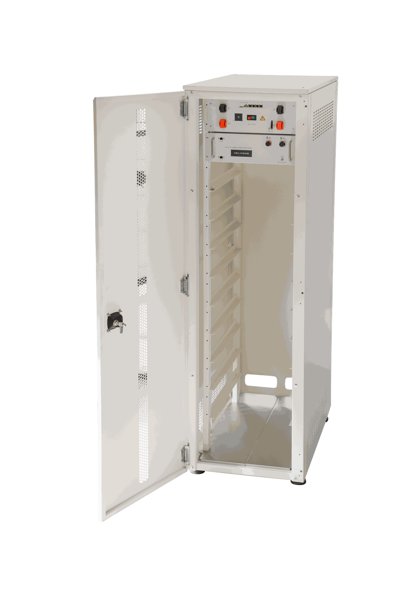 Onze eigen ontwikkelde en geproduceerde MEO behuizing. Speciaal gemaakt voor het veilig bewaren en kunnen onderhouden van onze PowerRack batterijen. In de behuizing kun je tot 60kWh of 100 kWh aan opslagcapaciteit plaatsen. Modulair uit te breiden en eventueel te verkrijgen in allerlei kleuren.